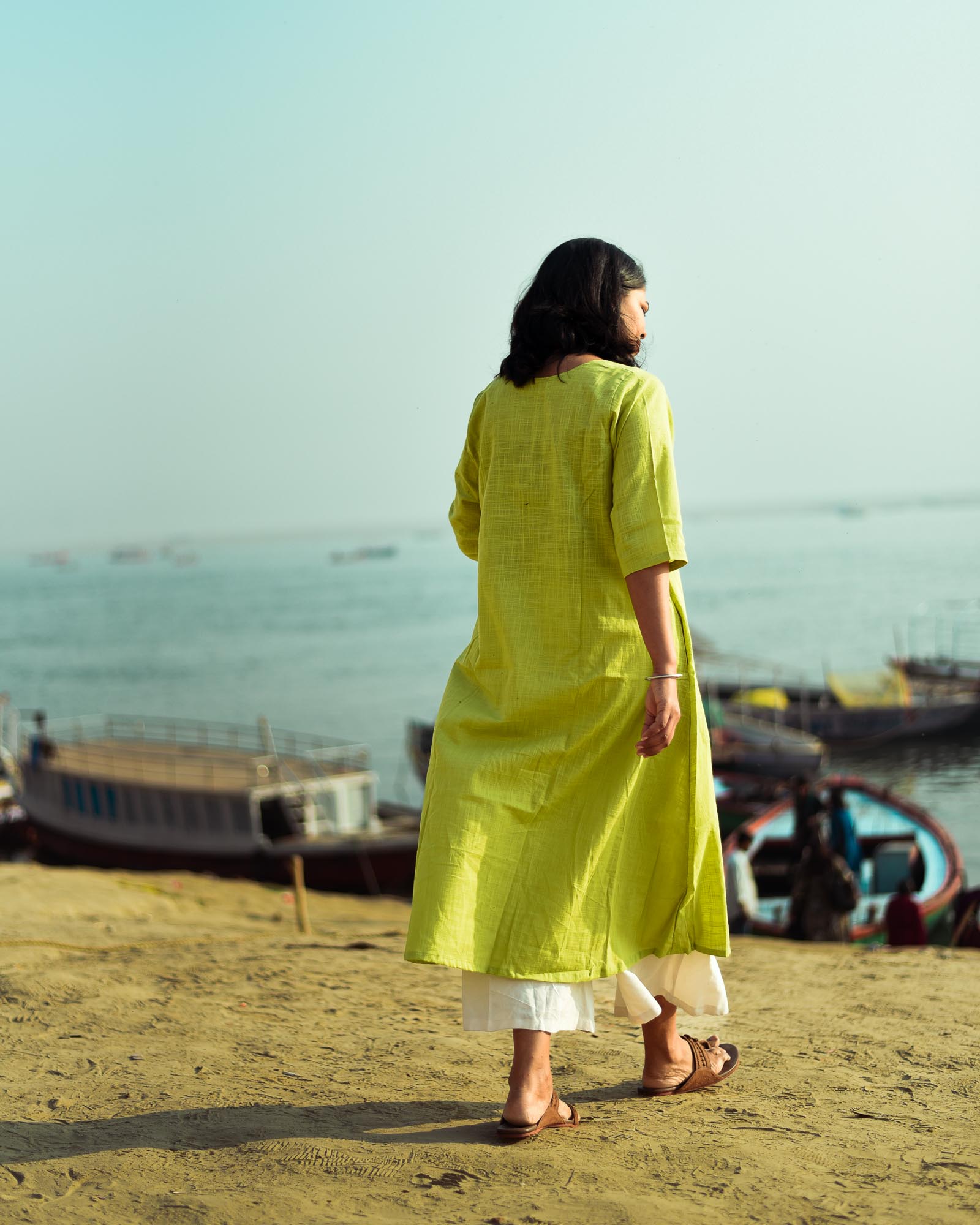 The relaxed silhouette allows ease of movement while the textured cotton fabric keeps you cool and comfortable through long days. Whether you’re stepping out for errands, working from home, or meeting friends for chai, this kurta is the kind of piece you will reach for again and again.